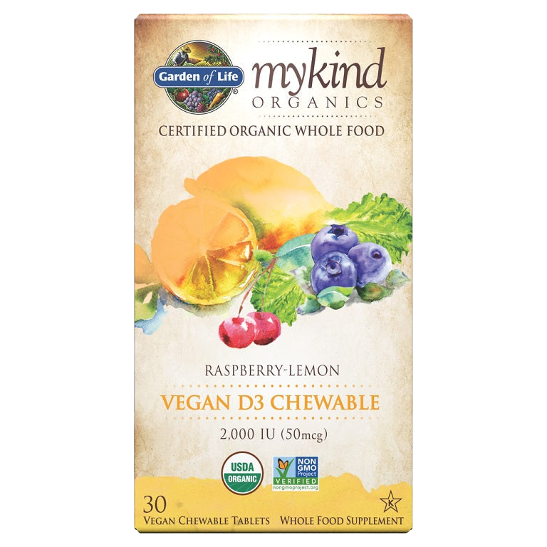 • This Raspberry-Lemon flavored Garden of Life Mykind Organics Vegan D3 Chewable delivers a wholesome and effective source of Vitamin D3, derived from lichen—making it ideal for vegans and vegetarians alike. With 2000 IU (50 mcg) of cholecalciferol, the active form of Vitamin D that's synthesized naturally by the body from sun exposure, this chewable supplement ensures you receive the nutrients necessary for maintaining a healthy immune system and supporting calcium absorption for strong bones.